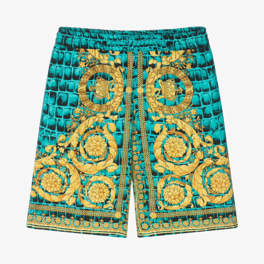 Made in Italy, these blue-green and gold shorts for older boys are designed by luxury brand Versace. Inspired by the adult collection, they are spun from lightweight silk twill which creates a relaxed, fluid silhouette for casual wear. The modern Barocco crocodile print combines the house's iconic gold swirls with black crocodile scales for a bold, opulent look. They have an elasticated waistband and a single pocket on the back.