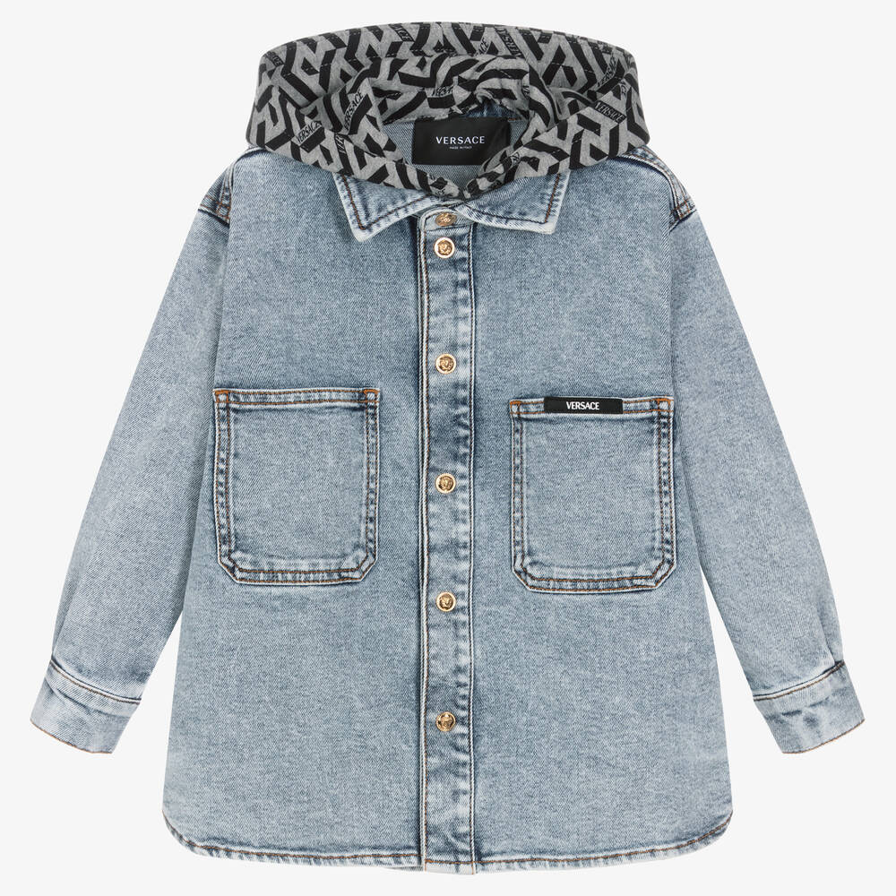 Stylishly casual, this blue cotton denim shacket for boys is by Versace. Ideal as a shirt or as a lightweight jacket, this versatile modern luxury piece features a removable grey cotton jersey hood with a black La Greca pattern. It has gold-tone Medusa poppers on the front and cuffs for that instantly recognisable Versace signature. The washed-look denim has a comfortable stretch and a relaxed fit with patch pockets and seamless hand pockets on the front.