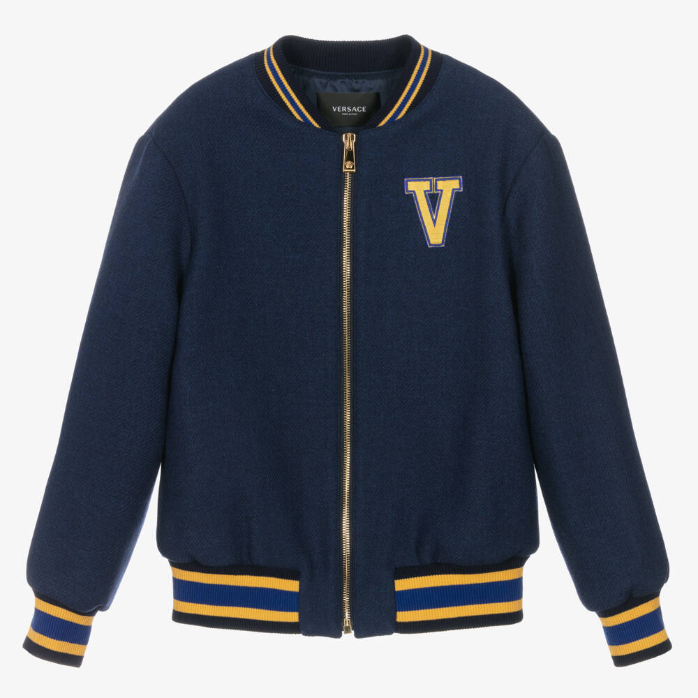Blue jacket for boys by luxury brand Versace, made in a luxurious, softly brushed wool blend. In cool, varsity styling, it has a gold embroidered 'V' appliqué on the front, with the brand's logo and iconic Medusa motif in gold on the back, making an instant, bold designer statement. Lined in silky cupro for comfort, It has useful concealed side seam pockets and a gold-tone branded zip fastening. Gold and blue striped ribbed trims, give a comfortable, sporty finish.