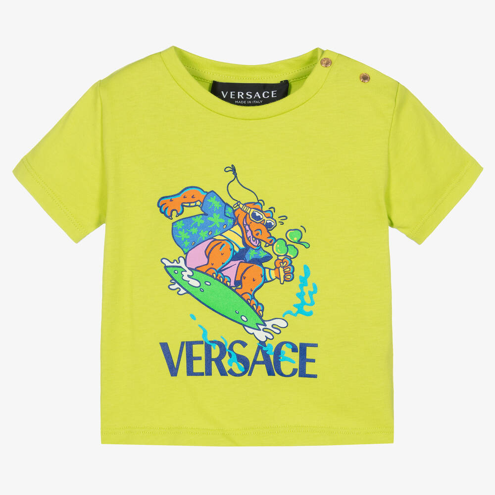 Add a pop of colour to your little boy's wardrobe with this lime green T-shirt, designed by luxury brand Versace. Made in soft cotton jersey, this crew neck tee has a cool surfing crocodile print on the front with the brand's logo printed underneath. Shiny gold logo-embossed poppers allow this cool logo-inspired tee to be fastened with ease.