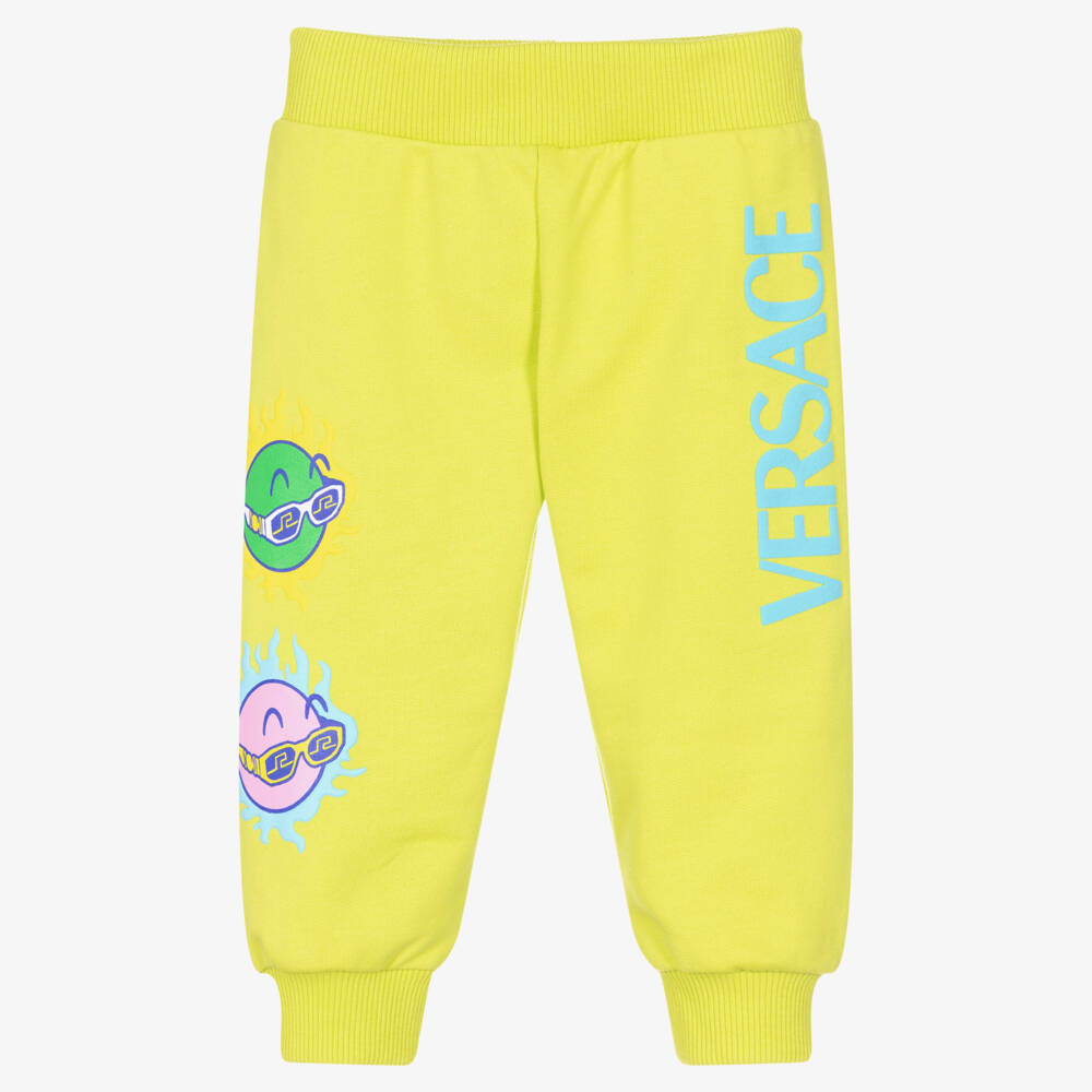 Cool and fun joggers in bright lime green for little boys by Versace. One leg is printed with the season's Medusa Sunnies in vibrant colours, while the other leg has a blue logo print on the front. Comfortable and casual, they are made in mid-weight cotton jersey with ribbed ankle cuffs and a patch pocket on the back.