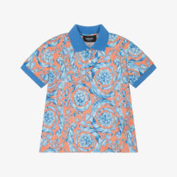 Stylish grey polo shirt for boys by luxury Italian designer Versace, made in soft and stretchy cotton piqué. It has the brand's instantly recognisable gold Medusa logo embroidered on the chest.