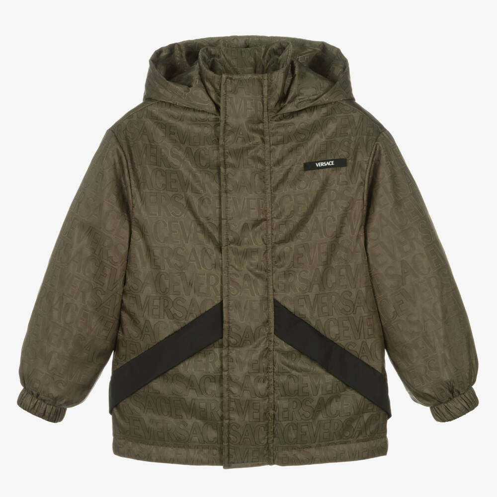In dark khaki green, this stylish hooded jacket for boys is by luxury Italian brand Versace. Silky smooth and lightly padded, it has a tonal all-over Versace logo print for an understated designer look. There is a black chevron design on the front and a black rubberised logo patch on the chest. To help keep out chilly winds, the sleeves are gently elasticated and there is a popper-fastening storm flap over the front zip.