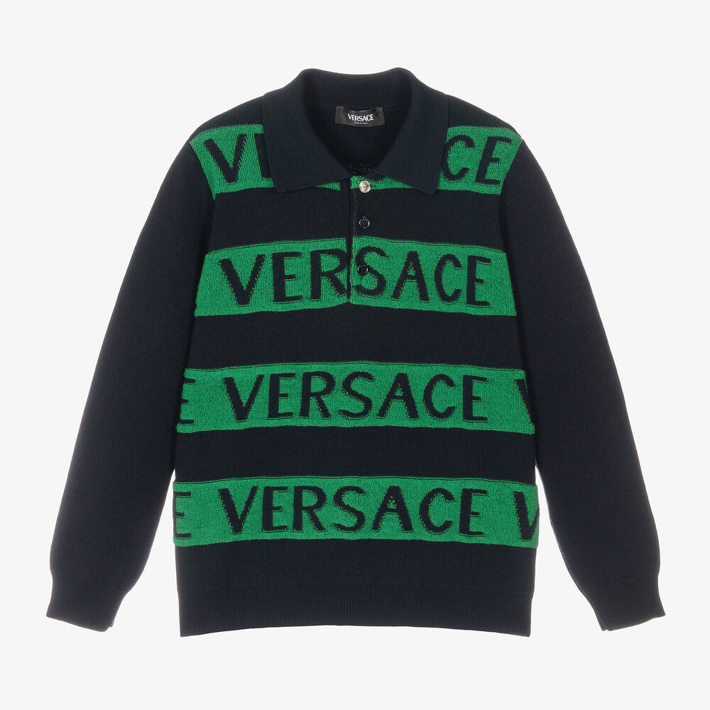 Smart casual navy blue sweater for boys by Italian fashion house Versace, knitted in luxurious virgin wool. Designed with a stylish polo-style collar, the front has soft towelling green colourblock stripes, featuring bold Versace logos. Adding to the brand's signature look, a silver-tone Medusa accent button fastens on the top of the short placket.