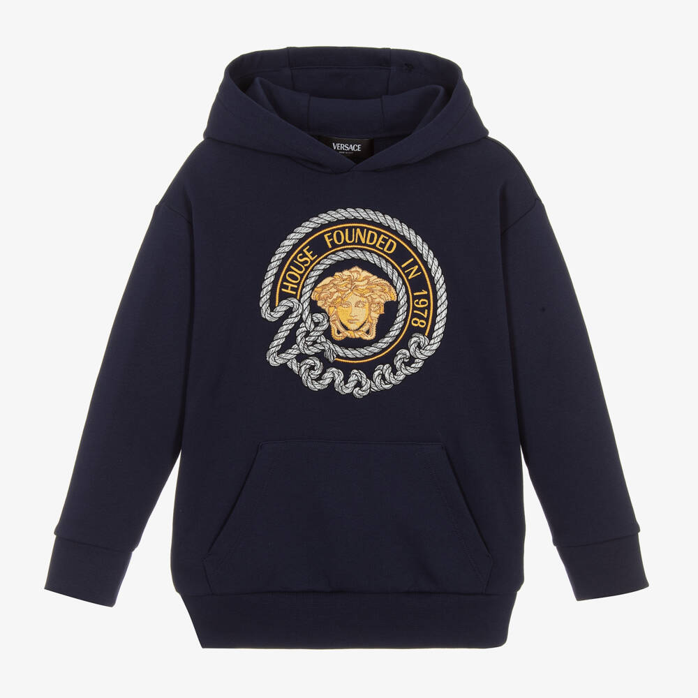 An iconic casualwear piece, this navy blue long-sleeved hoodie for boys is by luxury label Versace. Embroidered in gold and silver on the chest is the brand's Nautical Medusa logo, for a distinctive designer look. Made from soft cotton jersey, it has a handy pouch pocket on the front and an elasticated trim on the cuffs and hemline.