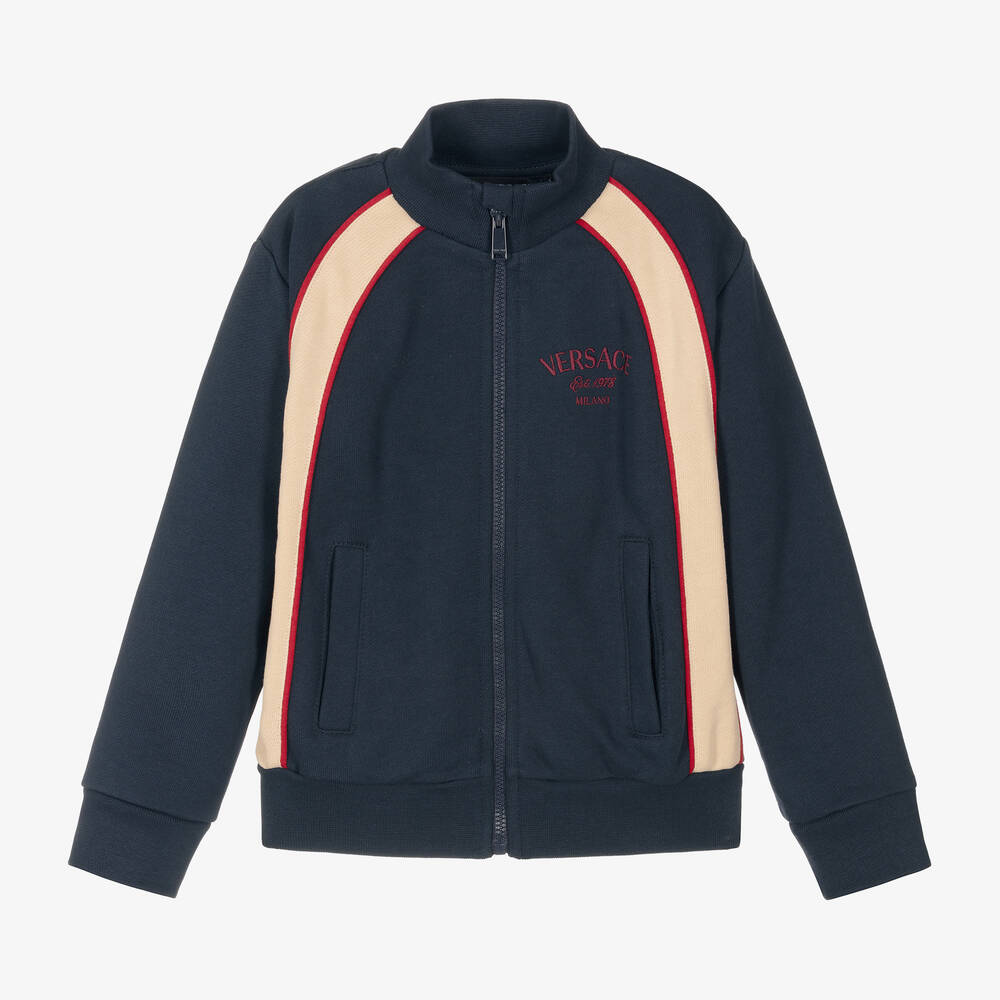 Casual navy blue cotton zip-up top for boys by luxury Italian label Versace, with a beige and red trim adding a sporty touch. For instant designer appeal, red logo embroidery can be seen on the chest and a branded zip fastens on the front. Made in soft and comfortable jersey, this stylish top has lightly ribbed trims, a stand-up collar and useful front pockets.