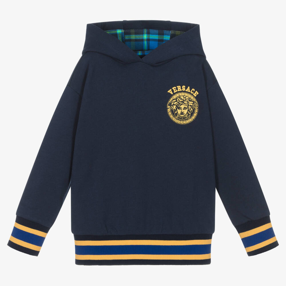 Navy blue hoodie for boys by luxury Italian brand Versace, made in a soft and comfortable cotton jersey. For designer appeal, it has the brand's iconic logo and Medusa motif embroidered in gold on the chest. The hood is lined with a blue and green tartan and the contrast gold and blue ribbed trims, give this cool top a sporty finish.