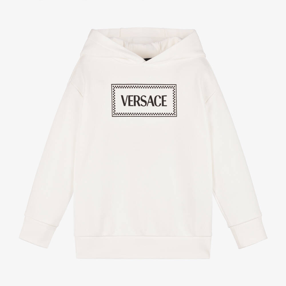 Stylish off-white hooded sweatshirt for boys from luxury Italian label, Versace. For instant designer appeal, it is printed with the house's archival 90's vintage logo in black. It is made in comfortable cotton jersey with dropped shoulders and ribbed trims completing the casual look.