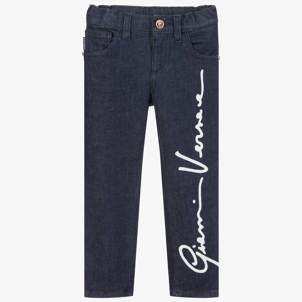 Boys dark blue jeans by Italian brand Versace. Made from luxury stretch cotton denim with five-pocket styling, one leg has a white Gianni Versace signature logo print. There are golden Medusa studs on the sides and they fasten with front zip, secured with a golden Medusa button.