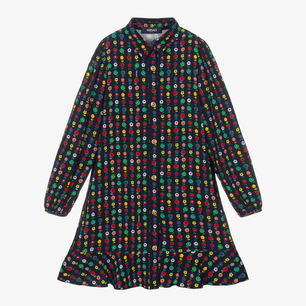 A stylish, smart casual black shirt dress for girls by luxury Italian designer Versace, patterned with rows of colourful flowers and logos. Made with soft viscose crêpe, it drapes beautifully in a relaxed fit with a lovely ruffle hemline and puffed long sleeves. For a truly Versace signature look, this dress fastens with Medusa '95 accent buttons in gold tone.