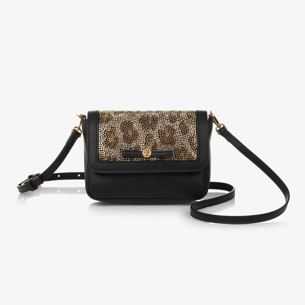 Girls Black Leather & Leopard Stud Handbag (16cm)