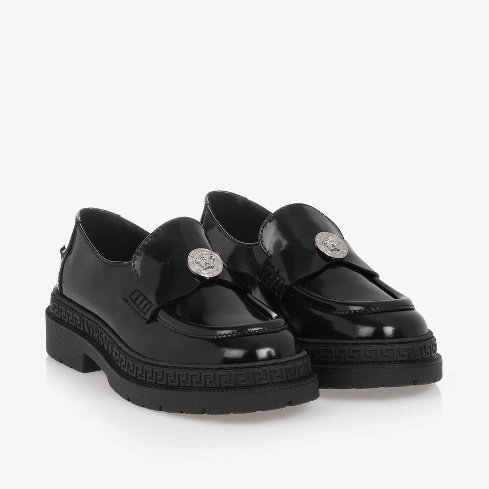 Smart and stylish black patent leather loafers for girls by Italian designer, Versace. Luxuriously smooth and glossy, they have a silver-tone Medusa medallion on the penny loafer strap, infusing the brand's signature opulence into this timeless style. Easy to slip on, they are fully lined in soft leather with a lightly padded insole for comfort. The recognisable Greca pattern is moulded on the mid-sole with further icons stamped on the ridged rubber outsole.