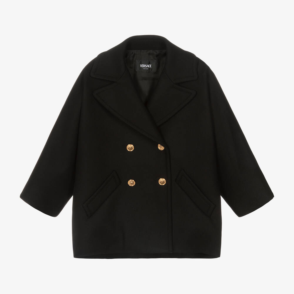 From luxury Italian fashion house Versace, a timeless black peacoat for girls made in felted wool and cashmere. This tailored, double-breasted design is beautifully lined with silky smooth satin and fastens with golden Medusa hardware for a signature designer finish. The boxy fit gives this formal jacket a cape-like appearance, ensuring it always remains in style.