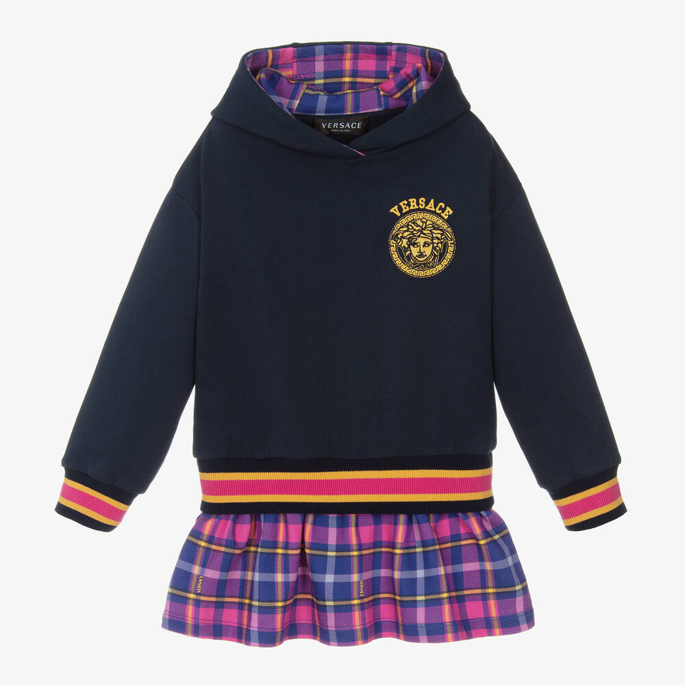 A navy blue and purple sweatshirt dress for girls by luxury Italian designer Versace, made in soft cotton jersey. Cool yet casual, it has a golden yellow Medusa embroidered on the chest, with a tartan logo patterned hood lining and skirt. Ribbed stripe trims finish the cuffs.