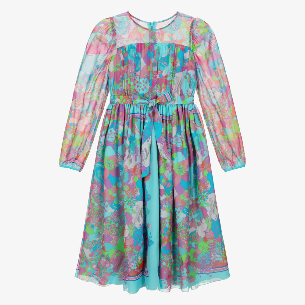 A beautiful blue silk dress for older girls by luxury Italian brand Versace, designed in a multicoloured, 60s-inspired Floral Summer print. Incorporating a Greca chain within the design, this midi-length dress has sheer puff sleeves that gently gather on the shoulder. The cuffs are lightly elasticated for volume and comfort. Fully lined in a silk blend, this sophisticated style has a gathered bodice, a rounded neckline, and a concealed zip fastening on the back. A removable tie belt in a matching print gives it a finished look and a feminine silhouette.