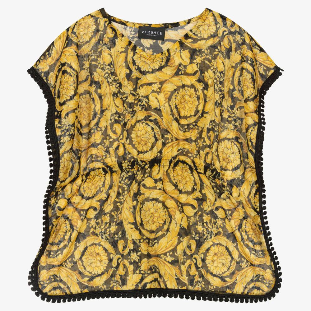 Lovely gold beach kaftan for girls by Italian luxury designer Versace, made in a super lightweight silk blend. Trimmed with black pom-poms, this bold kaftan bears the brand's unmistakable gold Barocco print. An elasticated waist provides ultimate comfort for all-day wear at the beach.
