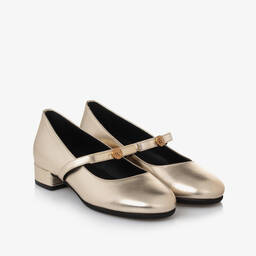Chic gold ballerina pumps for girls by luxury designer, Versace. Made in supple leather, these beautiful occasion shoes simply slip onto the foot. The supportive strap is adorned with a cute bow and the label's iconic shiny gold Medusa charm. A block heel elevates the foot for an elegant finish.