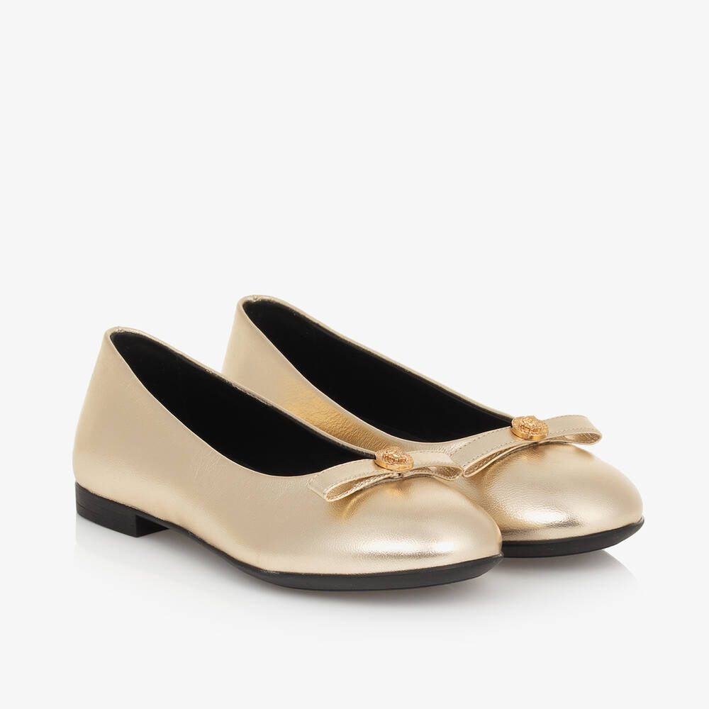 Gold ballerina pumps for girls by luxury brand Versace, made in soft leather with a delicate sheen. An elegant look, they are designed with bows and enhanced by Medusa logo motifs on each toe. Comfortable and luxurious, the lining and insole are also soft leather. The non-slip rubber outsole is flexible, with a small heel.