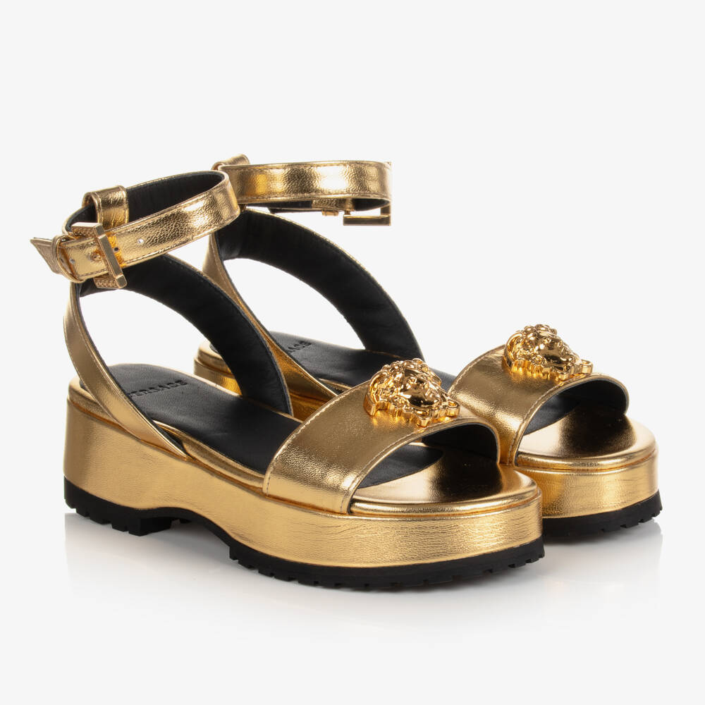 Gold sandals for girls by Italian designer Versace, made with a luxuriously soft leather outer and insole. Eye-catching and glamorous, they have an iconic Medusa plaque on the front, and an adjustable buckle fastening with the signature Greca logo on the ankle. These sandals have a fashionable chunky rubber sole.