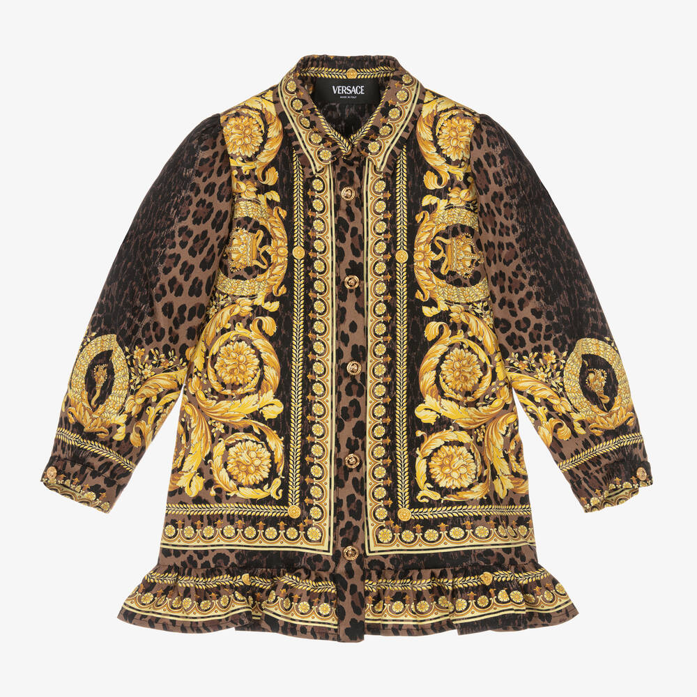 Inspired by the adult collection, this stylish gold and brown silk shirt dress for little girls is by luxury Italian designer Versace. Made in sumptuous, foulard-style silk twill, the fashion house's signature Barocco motif is printed over a leopard pattern. This smart dress drapes beautifully in a loose fit with a ruffled hemline and gently puffed long sleeves. It fastens with the iconic Medusa buttons on the front and cuffs.