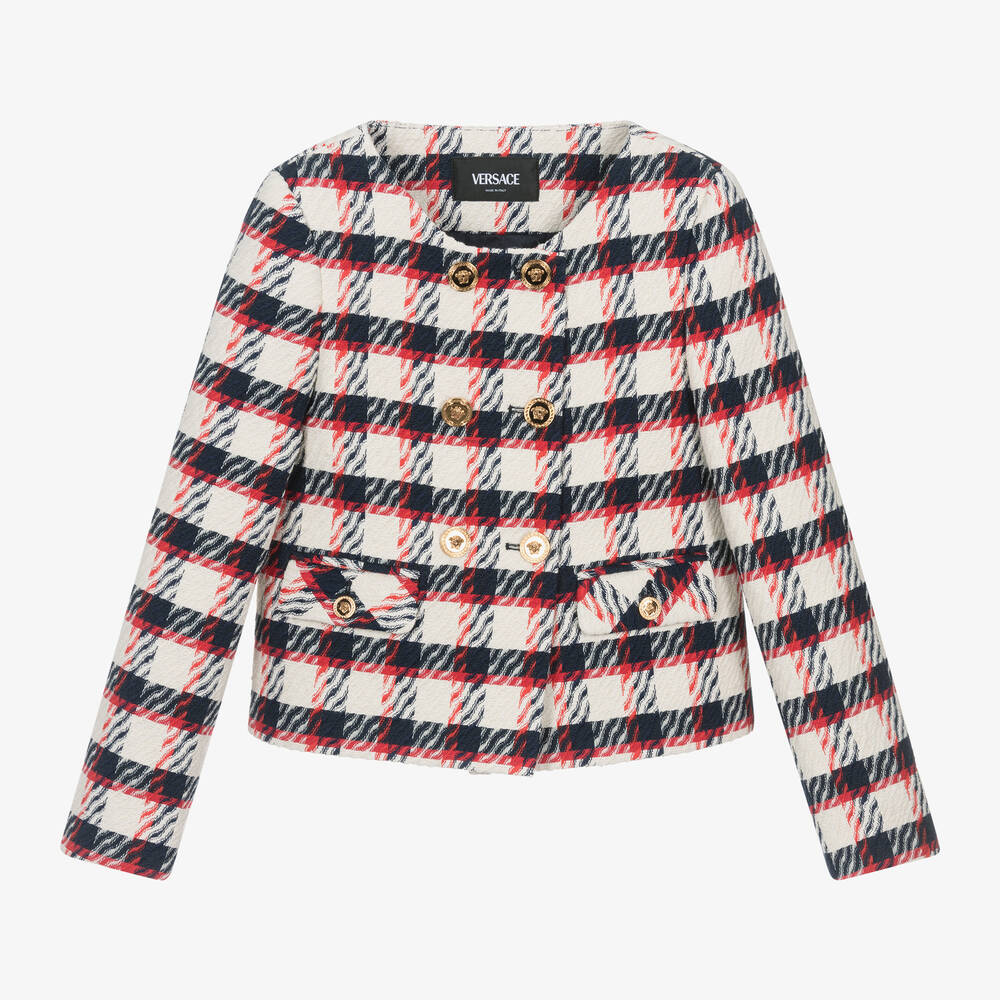 Chic ivory blazer for girls by luxury designer, Versace. Woven in soft cotton blend tweed with a preppy navy blue and red check design, this sophisticated layering piece is styled with a boxy fit. It has shiny gold Medusa buttons fastening the front in a timeless double-breasted design. It is lined in soft and silky cupro for comfortable wear.