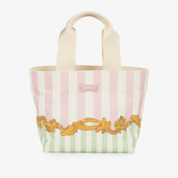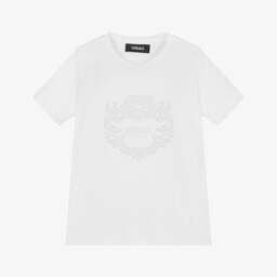 These light blue jeans for girls by luxury Italian label Versace, are a stylish addition to any wardrobe. Made in soft cotton denim with a slight stretch for comfort, they have a modern wide-leg silhouette and front patch pockets, one of which features a sequinned seashell motif. A gold-tone Medusa logo button and rivets add a signature finish.