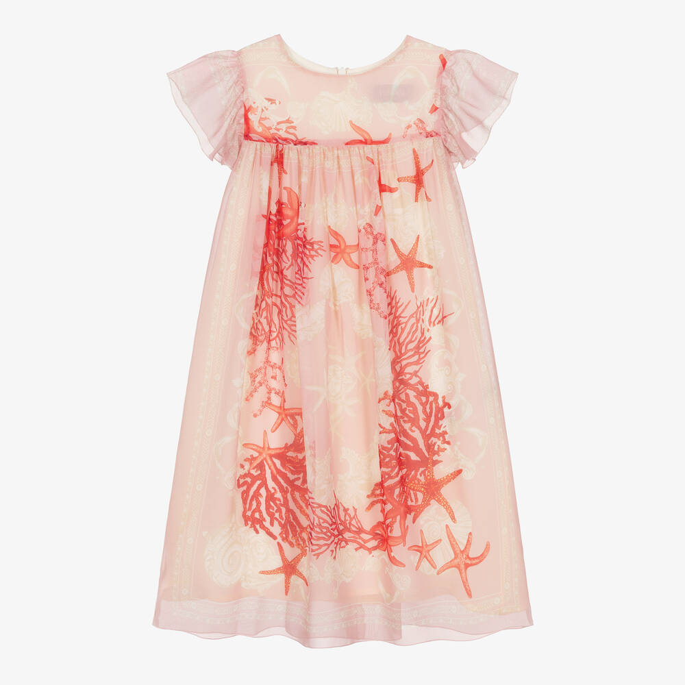 A beautiful pink dress for girls by luxury designer Versace, made in lightweight silk georgette with a slightly textured feel. Inspired by the adult's collection, this romantic dress is patterned with the Italian brand's Barocco Sea print. The ornate light beige seashells and the vibrant red coral can be seen across the iconic La Vacanza collection for a striking look. The semi-sheer fabric is lined with silk-blended crêpe chiffon for a stunning drape. Sheer frill sleeves and a concealed zip fastening on the back both complete this delicate design.