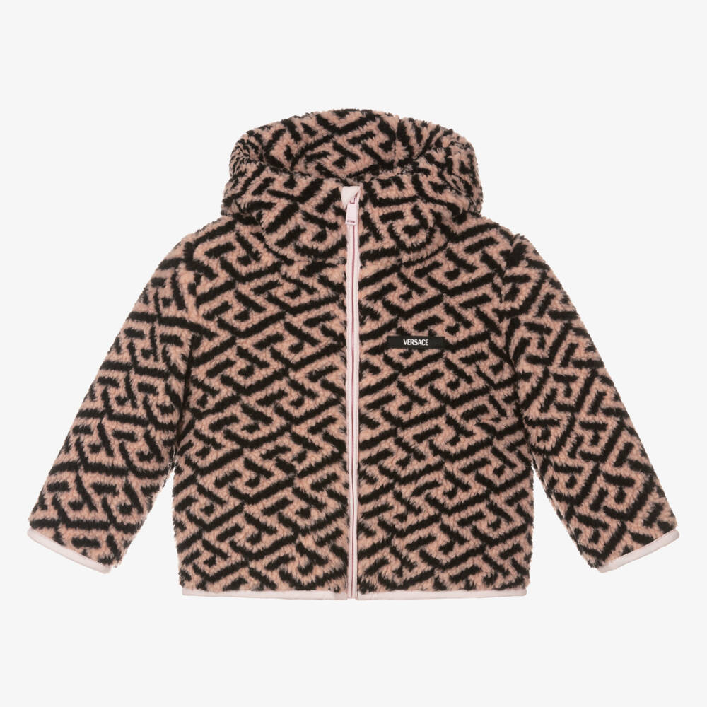 Cosy teddy fleece jacket for little girls by Versace, in the luxury brand's pale pink and black all-over Greca print. There is a little silicone logo patch in black and white on the chest and silky pale pink trims. The hood is teddy fleece-lined for extra warmth and it has a practical zip-up front. Plush and lightly padded, this stylish piece will get little ones through when the weather gets cooler.