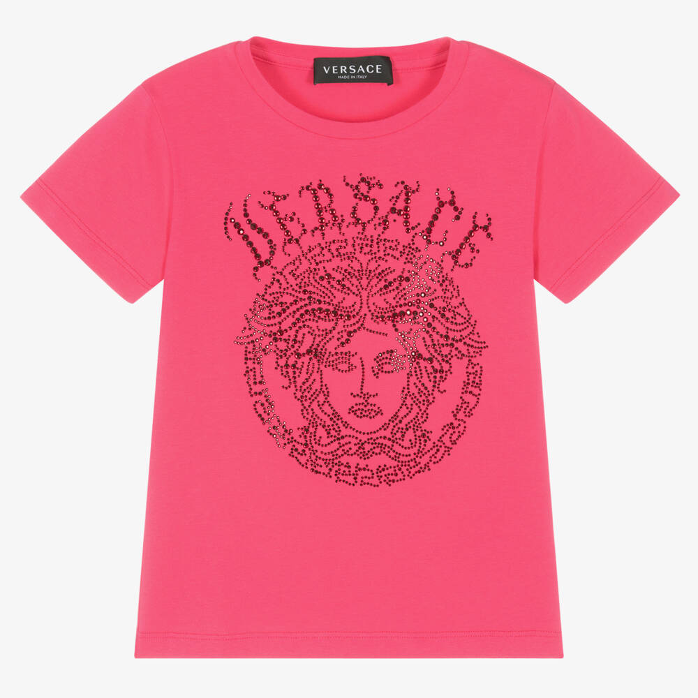 Sparkling stand-out pink cotton T-shirt for girls by luxury Italian designer Versace. It has the brand's iconic Medusa logo on the front in contrasting pink rhinestones, which glitter as they catch the light. The T-shirt is made in soft, stretchy jersey, ideal for both comfort and style.