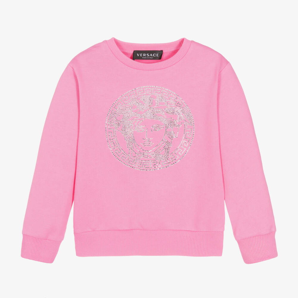 Girls bright pink luxury sweatshirt by Versace, made in comfortable cotton jersey. The front features a sparkly crystal Medusa head logo creating a sophisticated designer finish. The crew neckline, cuffs and hem are ribbed and stretchy.