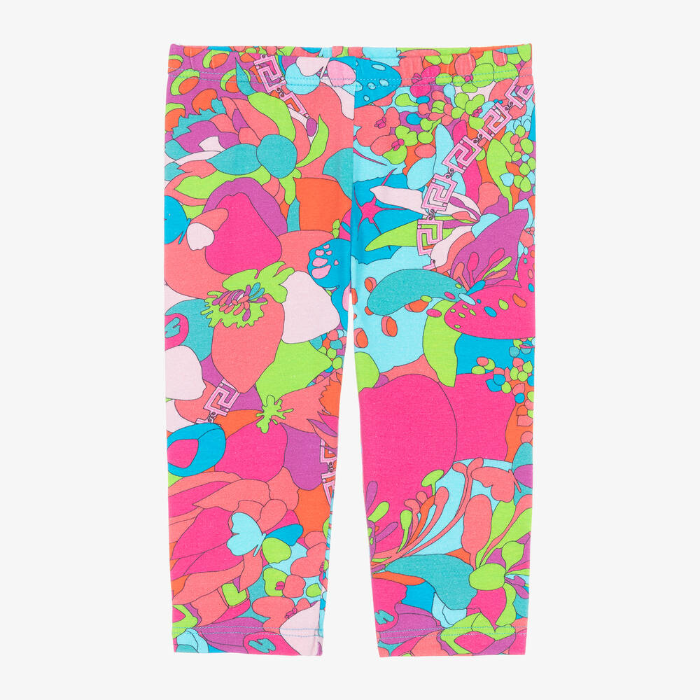 Quirky bright pink Mini-me leggings for little girls by luxury Italian brand Versace, made from soft cotton jersey. Printed in a gorgeous multicoloured retro 60's floral print, these leggings are inspired by the adult collection 'La Vacanza'. Elasticated for comfort, they add a fun pop of colour to your little one's wardrobe.