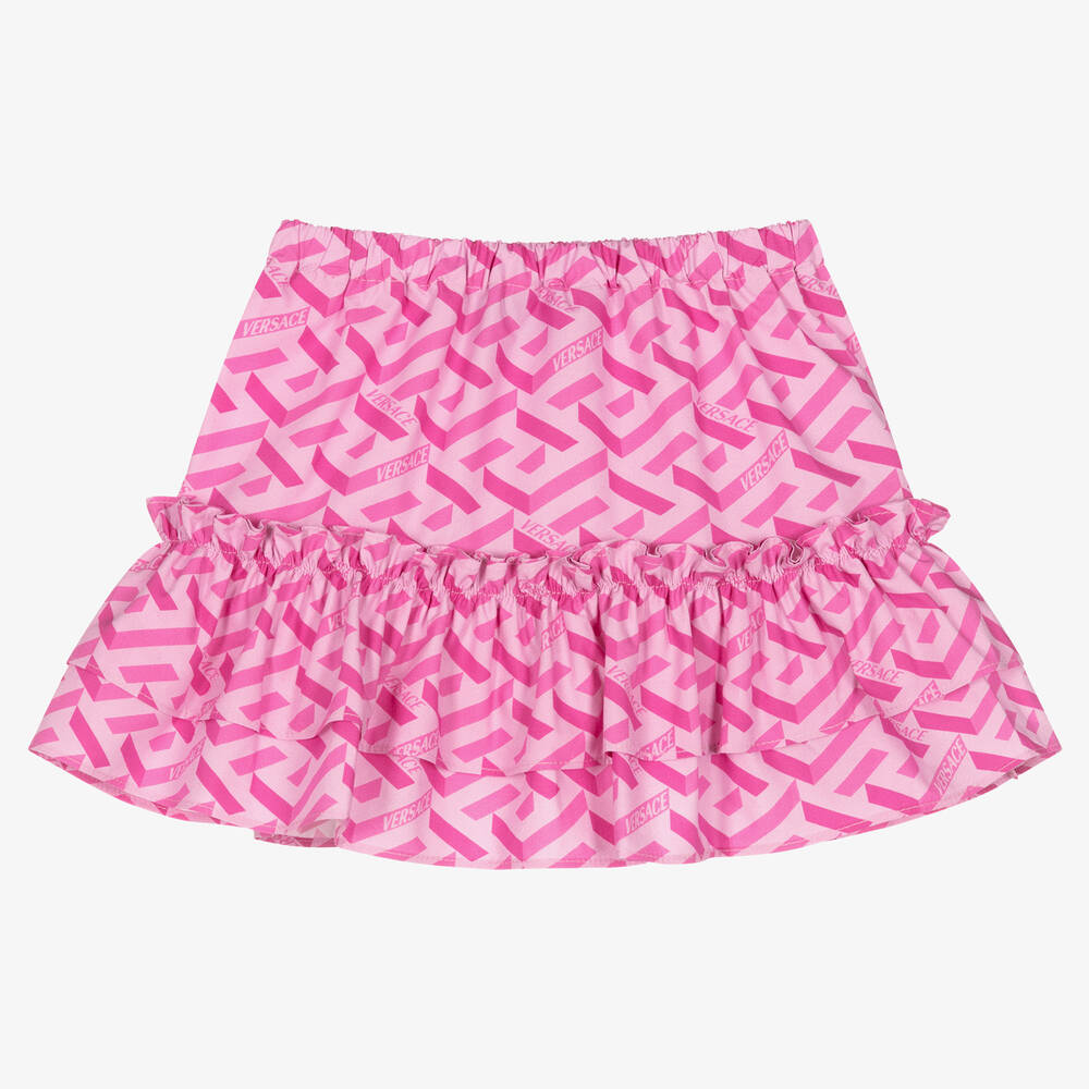 Adorable pink skirt for little girls by luxury Italian brand Versace, made in lightweight cotton poplin. It has an all-over print of the brand's La Greca pattern in a darker shade of pink. Easy to pull on with a gently elasticated waist, this flared skirt has lovely ruffle trims and sweet tiers around the hem.