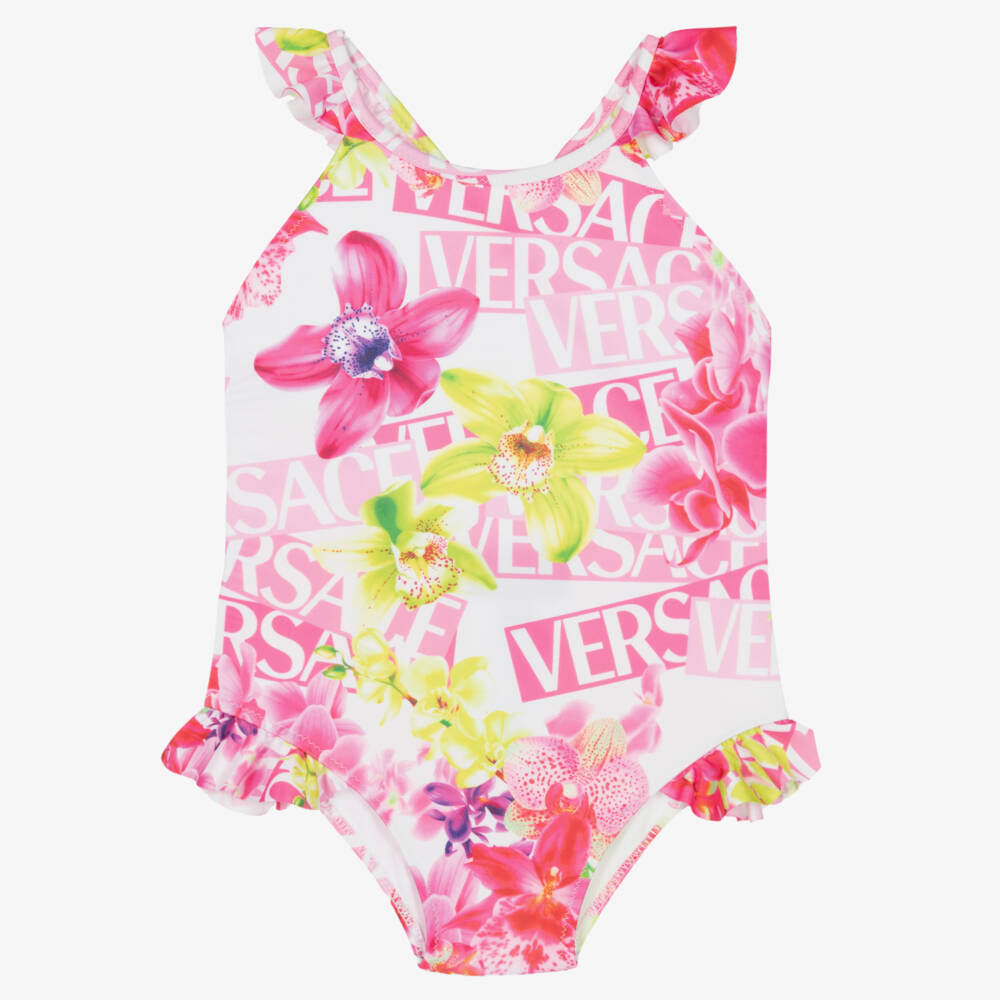 So pretty for little girls, this pink and white Orchid print swimsuit is by luxury Italian brand, Versace. It is patterned with eye-catching Versace logo and contrasting lime green Orchids. Silky smooth and stretchy with lovely ruffle details, it has adjustable criss cross straps on the scooped back and full lining for comfort.