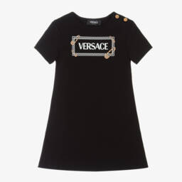 Simple yet elegant, a pale pink Milano jersey dress for girls by luxury brand Versace. This short-sleeved style has gold-tone Medusa button fastenings on one shoulder, with a shiny sequinned logo across the front for designer sparkle.