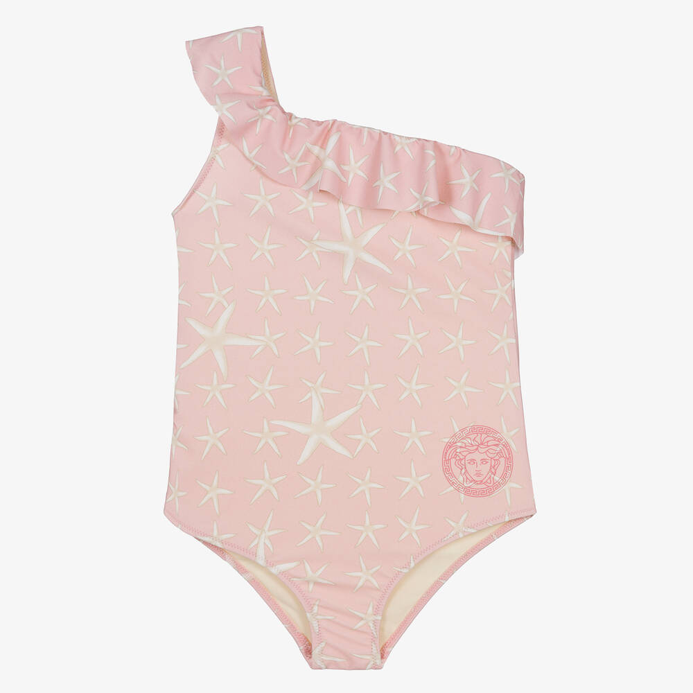 A stylish pink one-shoulder swimsuit for older girls by luxury Italian label Versace. Lovely for the pool or seaside, it is patterned with their pale beige starfish design and is printed with an iconic Medusa logo on one side for an added branded touch. Inspired by the main collection, it is soft and stretchy with a lightweight mesh lining and has a pretty ruffle trim for a delightful finish.