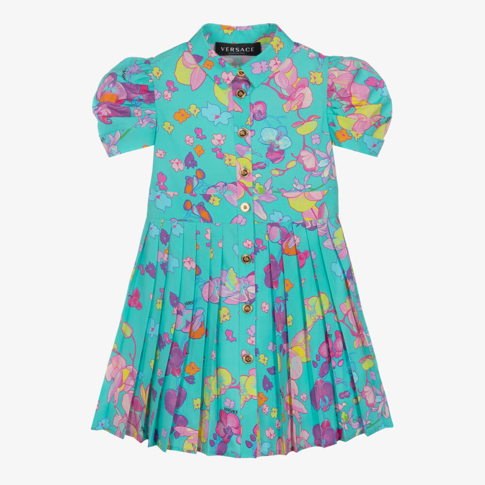 Smart, turquoise blue shirt dress for girls by Versace, made in luxury smooth cotton poplin. It has an all-over pattern of beautiful orchids with black logos incorporated in the graphic for subtle branding. The beautiful design is accentuated with elegant pleats on the skirt and puffed sleeves. A row of eye-catching golden Medusa buttons on the front give it a signature Versace finishing touch.