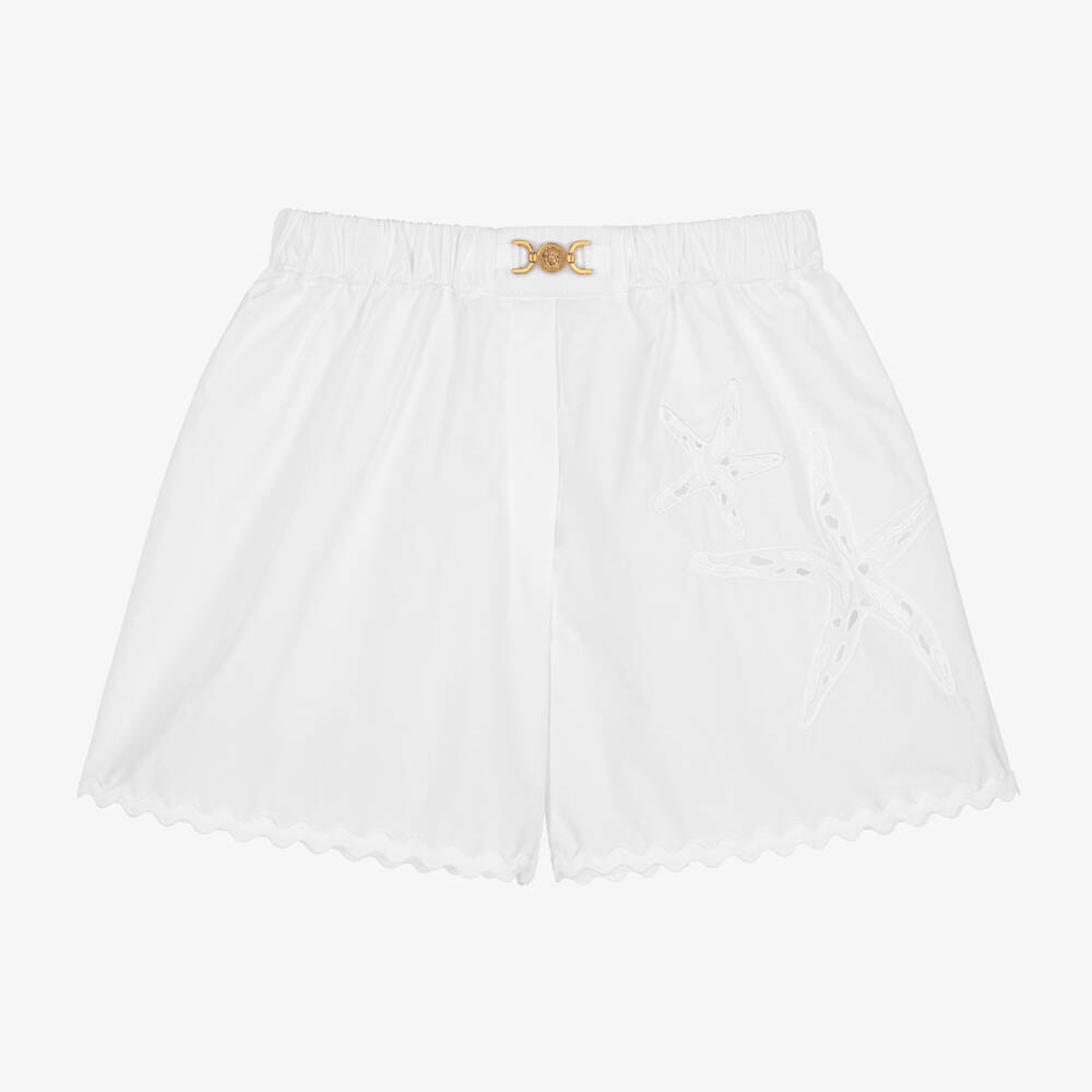 White shorts for girls by Versace, a design inspired by the adult collection. Great for those warmer months, these lovely shorts are made in lightweight cotton poplin and enhanced by embroidered starfish with Sangallo cutwork detailing. Trimmed with boho ric rac, they have the luxury designer's Medusa '95 hardware in a golden colour on the elasticated waist.