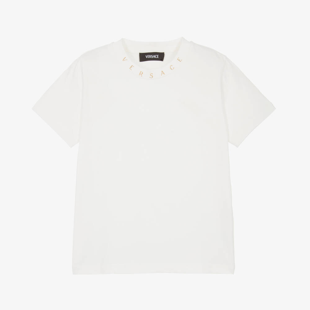 A white cotton T-shirt for girls by Italian label Versace, made in soft and comfortable jersey. For a discreet yet luxurious designer touch, it features a shiny gold beaded logo on the neckline.