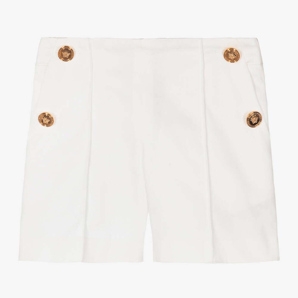 White cotton sailor shorts for girls by luxury Italian brand Versace, for both smart and casual days. They have shiny gold decorative buttons on the slanted front pockets, embossed with the signature Medusa, making a stylish designer statement. The waistband has a black elasticated panel around the back, patterned with the label's iconic Greca design. Made in soft twill, the shorts fasten with a discreet, concealed zip on one side.