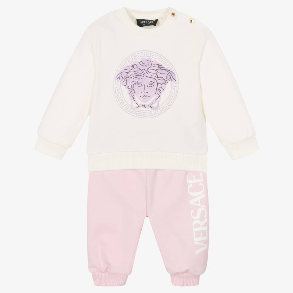 In ivory and pale pink, this cosy and comfy cotton jersey tracksuit for little girls is by luxury Italian brand Versace. The sweatshirt has the iconic Medusa logo printed in lilac on the front, with gold Greca-engraved popper fastenings to help with dressing. The joggers have a white logo print down one leg and a comfortable elasticated waistband.
