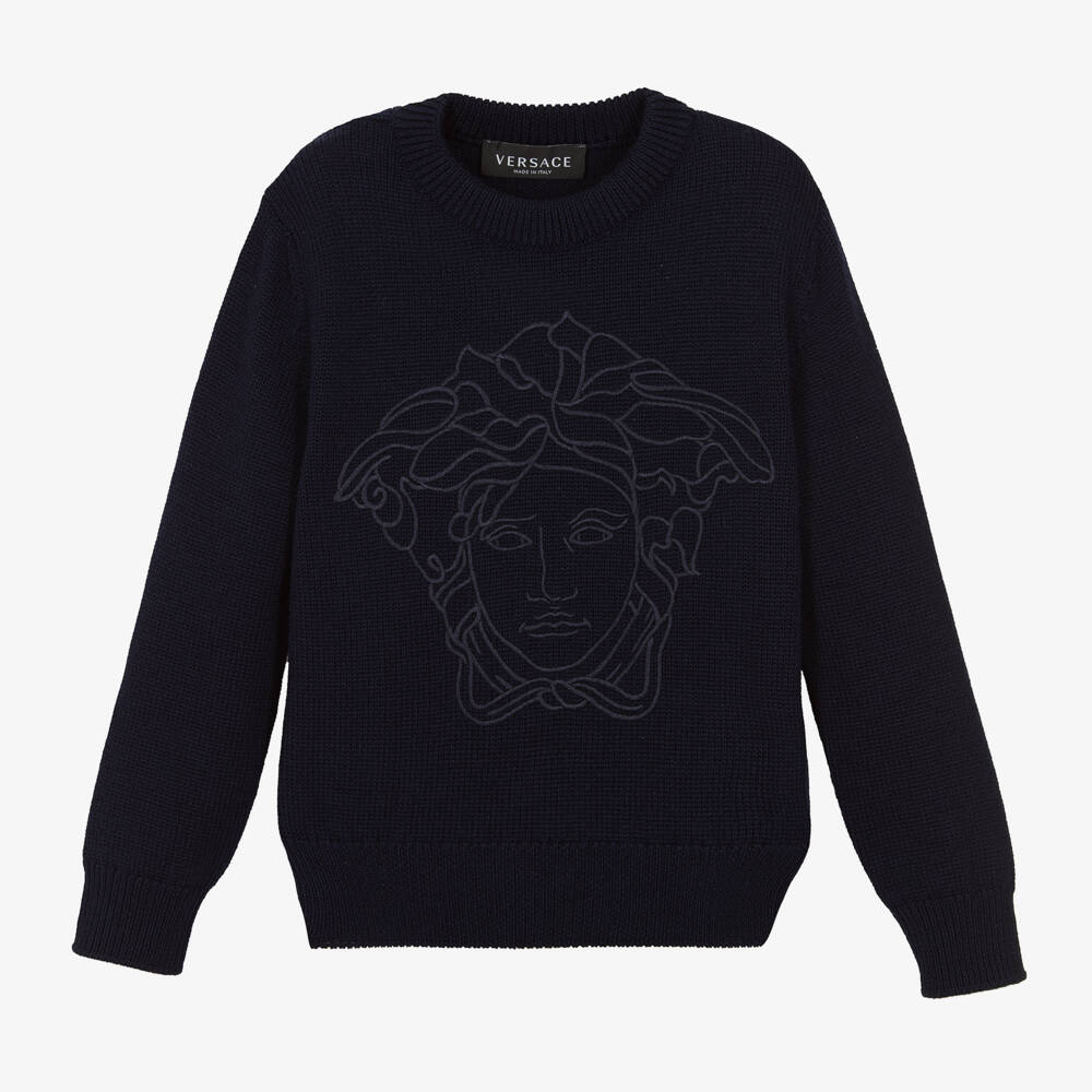 Stylish navy blue sweater for boys and girls by luxury Italian brand Versace, knitted in luxuriously soft virgin wool. Casual and cosy it has a ribbed neckline, cuffs and hem and features the brand's iconic Medusa logo embroidered on the front in tonal blue.