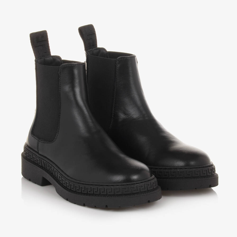 Black chelsea boots for teen boys and girls by luxury Italian designer Versace, made in smooth leather. Simple yet stylish, they have signature Greca trims on the midsole and a three-dimensional, silver Medusa on the back. Easy to pull on, this timeless style is lined in smooth leather with elasticated side inserts. The non-slip rubber soles are molded with a Greca pattern for further designer appeal.
