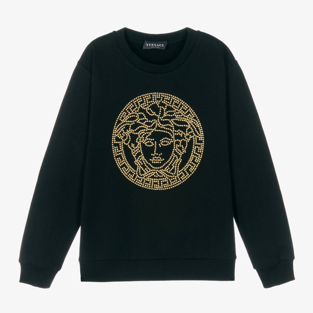 Instantly recognisable black sweatshirt for teen boys and girls by luxury Italian brand Versace, with their iconic Medusa logo on the front formed from gold studs. Ideal for lasting comfort, it is made in mid-weight cotton jersey with a looped underside.