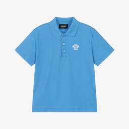 Stylish black polo shirt for teen boys by luxury Italian designer Versace, made in soft and stretchy cotton piqué. It has the brand's instantly recognisable gold Medusa logo embroidered on the front, and logo embossed front button fastenings for a discreet designer detail.