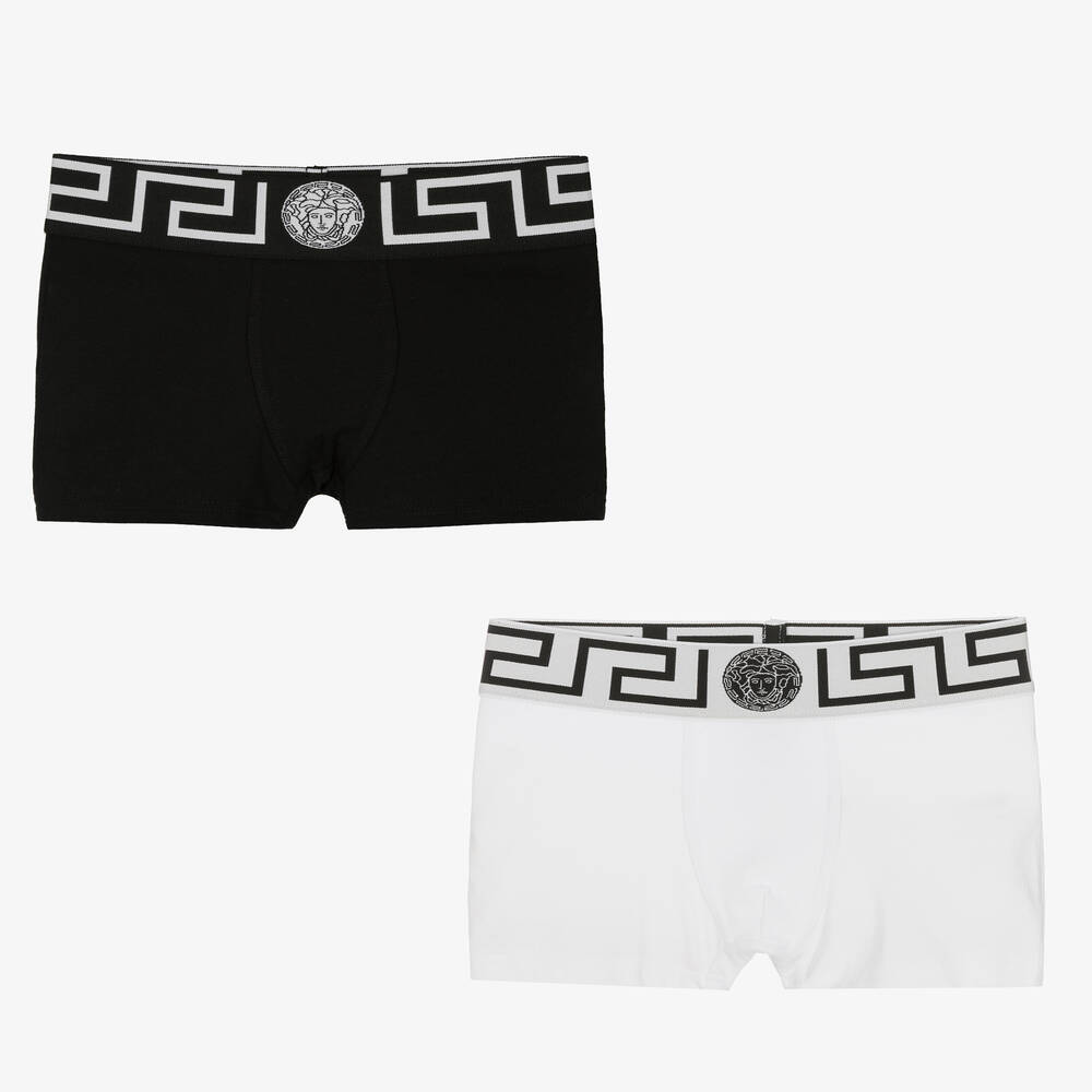 Two pairs of black and white boxer shorts for teen boys by luxury brand Versace. The elasticated waists are woven in the Italian designer's iconic Greca pattern, with a jacquard Medusa logo on the front. Both pairs are made in soft and stretchy cotton jersey for endless comfort.
