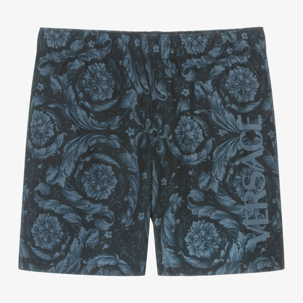 From luxury brand Versace, a pair of navy blue swim shorts for teen boys. For instant designer appeal, they are patterned with the Italian label's opulent Barocco print in shades of blue with a tonal logo on one leg. Made in silky, lightweight fabric with a comfortable stretchy jersey lining, they have an elasticated waistband and a patch pocket on the back.