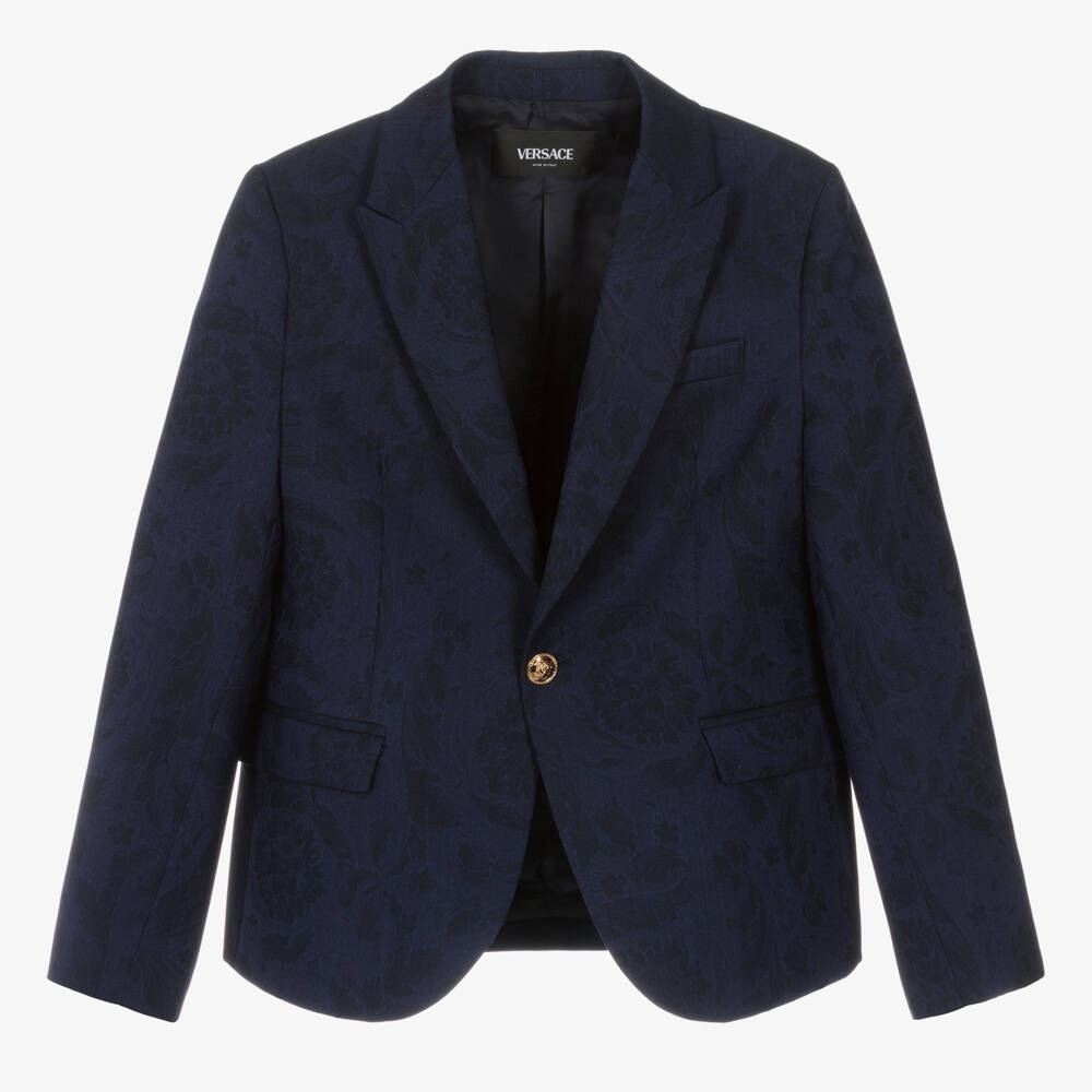 For stylish, formal wear this navy blue blazer for teen boys is from luxury Italian brand Versace. Expertly woven in soft virgin wool, it is designed with a subtle two-tone jacquard pattern of the brand's iconic Barocco print. Fully lined, this single-breasted style is detailed with notched lapels, front pockets and a double vent at the back. Gold-tone Medusa buttons on both the front and cuffs add a smart designer finishing touch.
