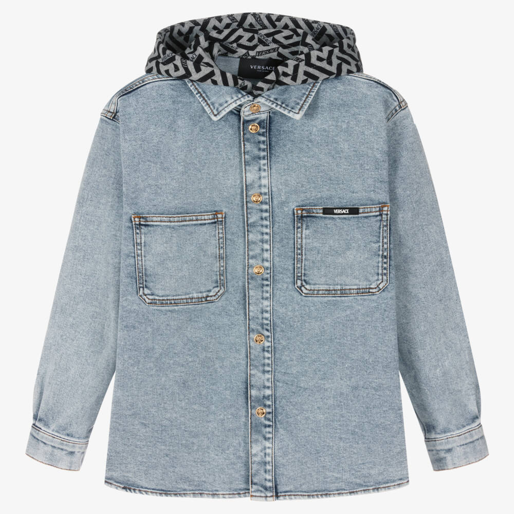 Cool blue denim shacket for teen boys by Italian designer Versace. A denim jacket with a twist, this style has a detachable jersey hood patterned in a bold black La Greca logo print. The versatile piece has gold Medusa logo poppers on the front and on the cuffs for added edge. One of the front pockets has a monochrome logo badge, finishing the luxurious shacket with a designer stamp. Layer over your favourite looks for an instant designer upgrade.