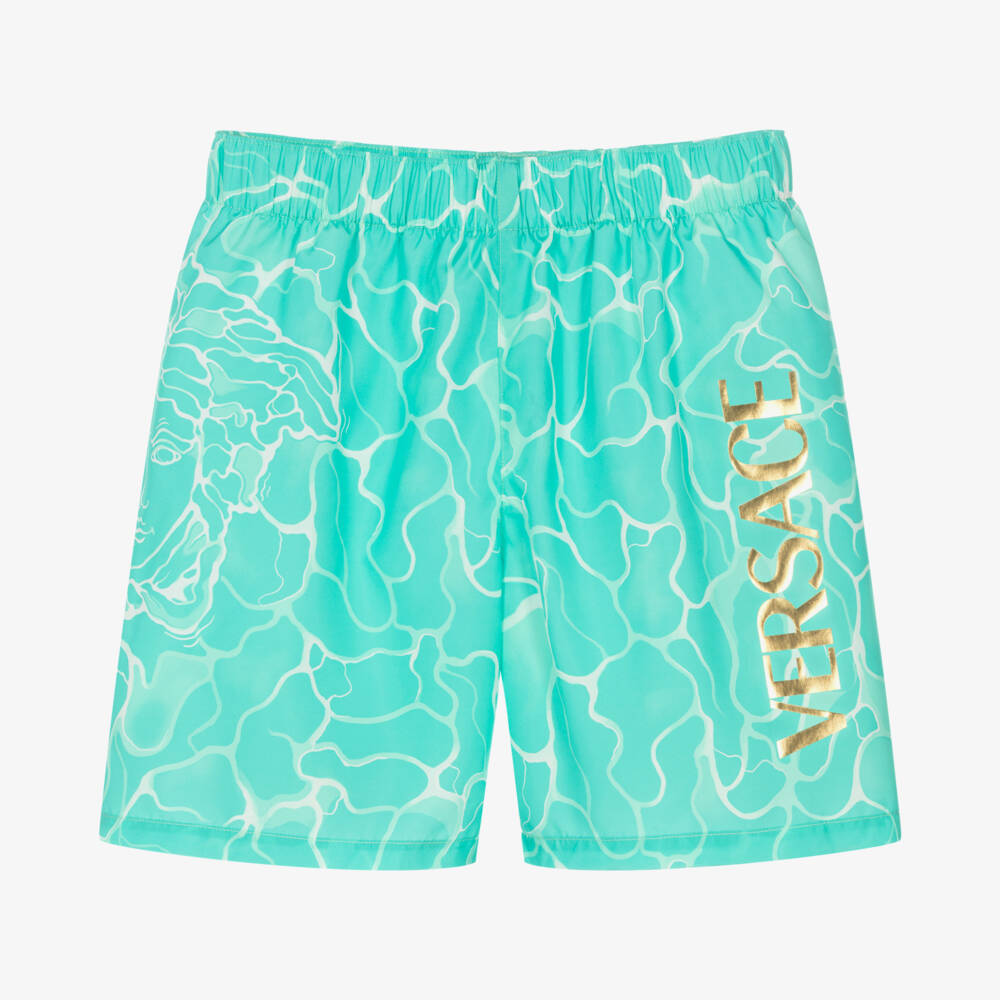 Summer-inspired turquoise blue swim shorts for teen boys, by luxury Italian brand Versace. Look stylish by the pool in these logo-inspired swim shorts, with a white water pattern infused with the Medusa icon and a gold logo print on one side. Silky smooth, they have a useful mesh lining and a stretchy waist for comfort.