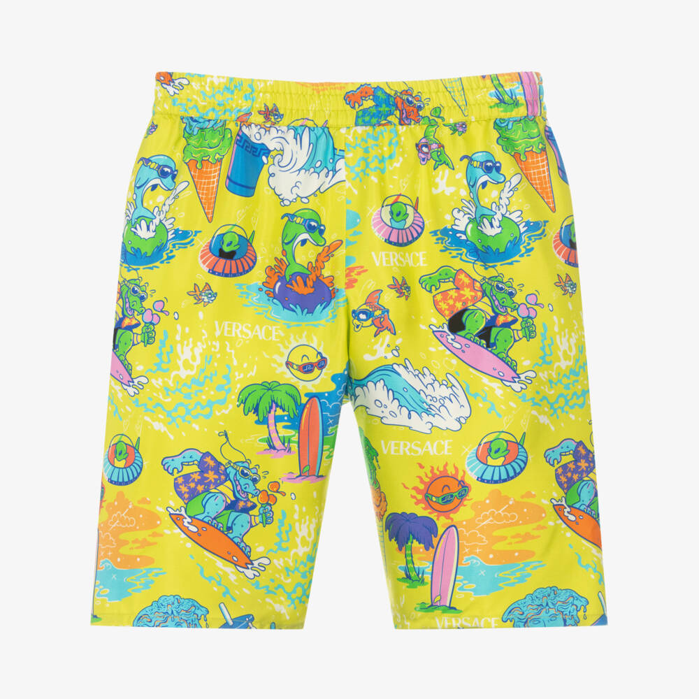 Teen boys lime green shorts by luxury brand Versace, crafted in lightweight silk for warmer days. Unmistakably Versace, these cool summer-inspired shorts have a quirky print of comical marine life wearing the iconic Medusa Biggie sunglasses in an explosion of colours. Elasticated at the waist for comfort, they promise to achieve a stand-out look and feature the logos incorporated within the print for a logo-inspired finish.